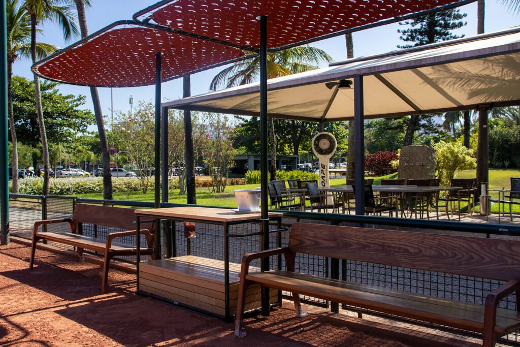 “Substituímos os antigos e pequenos ombrelones de fibra por coberturas modernas e elegantes, que oferecem um sombreamento mais agradável. Também instalamos bancos confortáveis e duráveis, que permitem um breve descanso entre os jogos — ou aquele momento para discutir e aperfeiçoar as táticas da partida”, destaca Custódio.